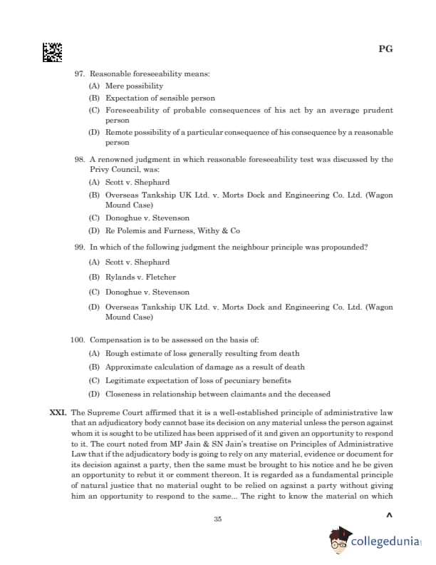 Comprehension: Read MoreFor a duty of care to exist, three conditions must be satisfied: (i) foreseeability of damage, (ii) proximity of relationship, and (iii) whether it is “just, fair, and reasonable” to impose a duty. In *Caparo Industries Plc. v. Dickman (1990)*, the court emphasized the standard of care required in the circumstances and whether the defendant’s conduct fell below it. The process of determining a breach of duty involves three steps: identifying the qualities of a reasonable person, determining the care such a person would take under the circumstances, and assessing if the defendant took less care than required. Negligence as a tort consists of a legal duty, breach of that duty, and resulting damage, as reiterated in *Rajkot Municipal Corporation v. Manjulben Jayantilal Nakum (1997)*. (A) A doctor prescribes the wrong medication to a patient, but the patient’s immune system prevents any harmful side effects and the patient does not suffer any injury (B) A driver runs a red light, narrowly avoiding an accident with another car and both vehicles continue without any collision or harm (C) A hotel guest tragically drowns in the swimming pool as the lifeguard was assigned duties as a part-time bartender (D) A construction company delays necessary maintenance on a bridge and despite having major cracks, the bridge remains functional |