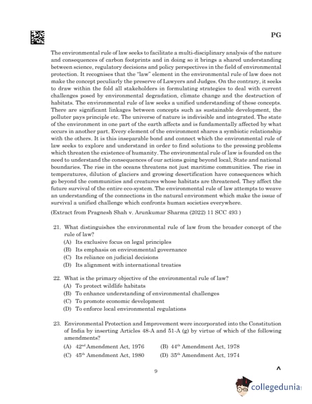 Comprehension: Read MoreThe environmental rule of law enhances understanding of past and present environmental challenges and the future risks posed by humanity's actions. It bridges science, regulatory decisions, and policy perspectives, involving all stakeholders in addressing environmental degradation, climate change, and habitat destruction. It emphasizes concepts like sustainable development and the polluter pays principle, recognizing the indivisible and integrated nature of the environment. It acknowledges that the state of the environment in one region impacts others globally due to the interconnectedness of natural elements. The environmental rule of law strives for a unified approach to solving pressing issues, such as rising sea levels, desertification, and temperature increases, which threaten the survival of the global ecosystem and humanity. (A) Its exclusive focus on legal principles (B) Its emphasis on environmental governance (C) Its reliance on judicial decisions (D) Its alignment with international treaties |