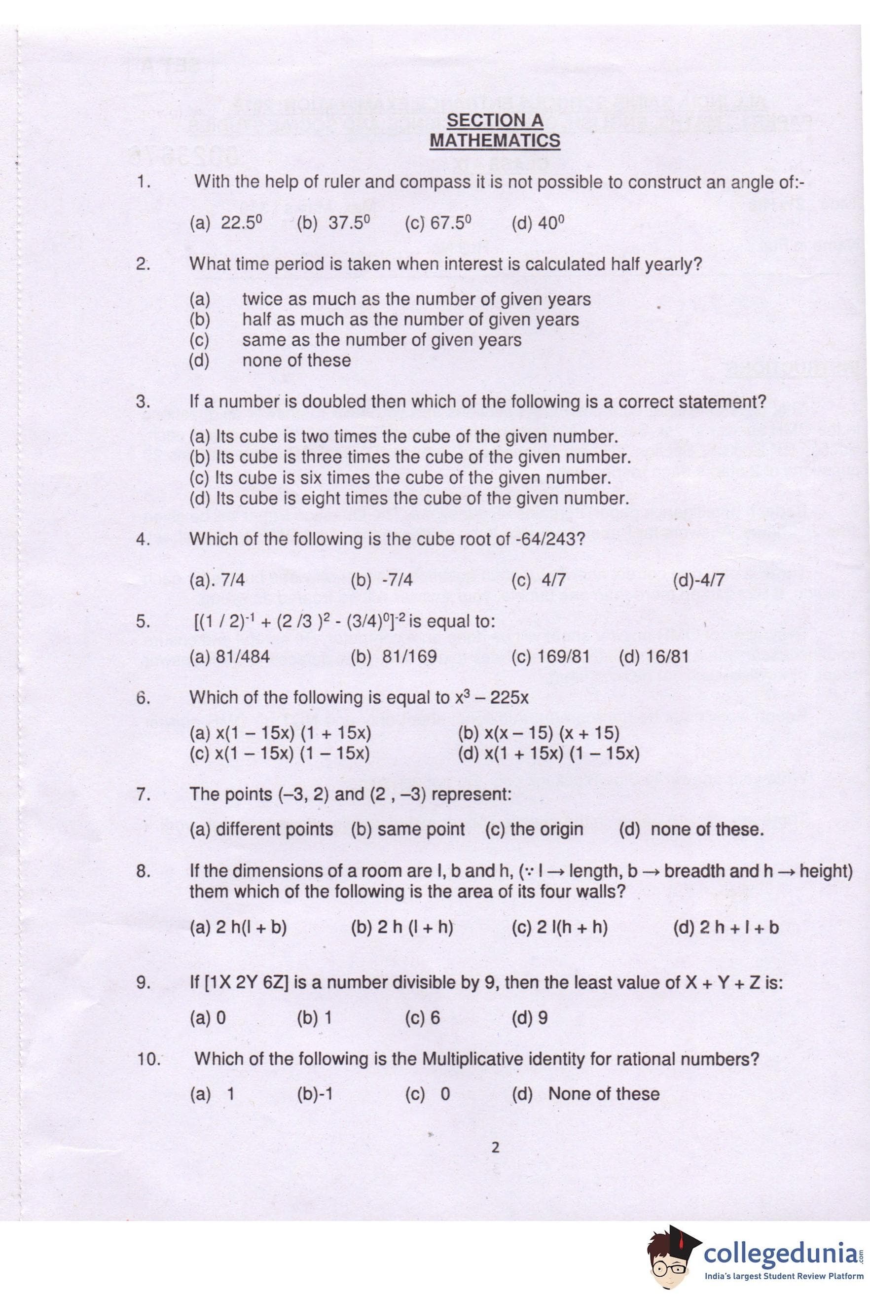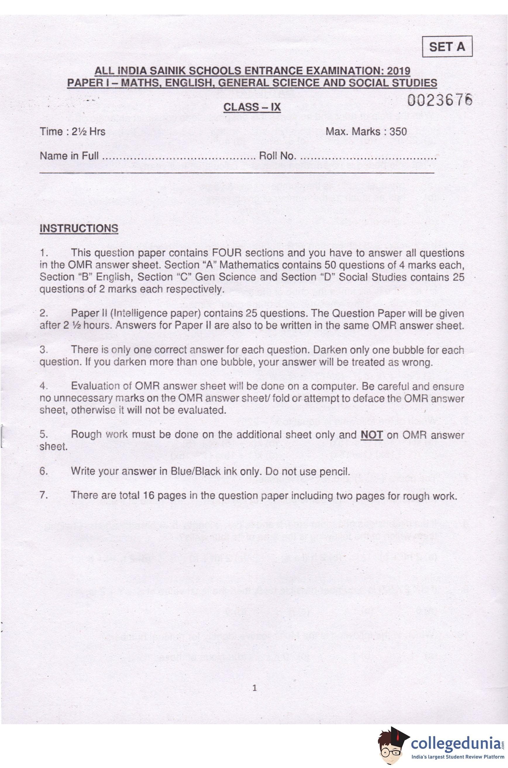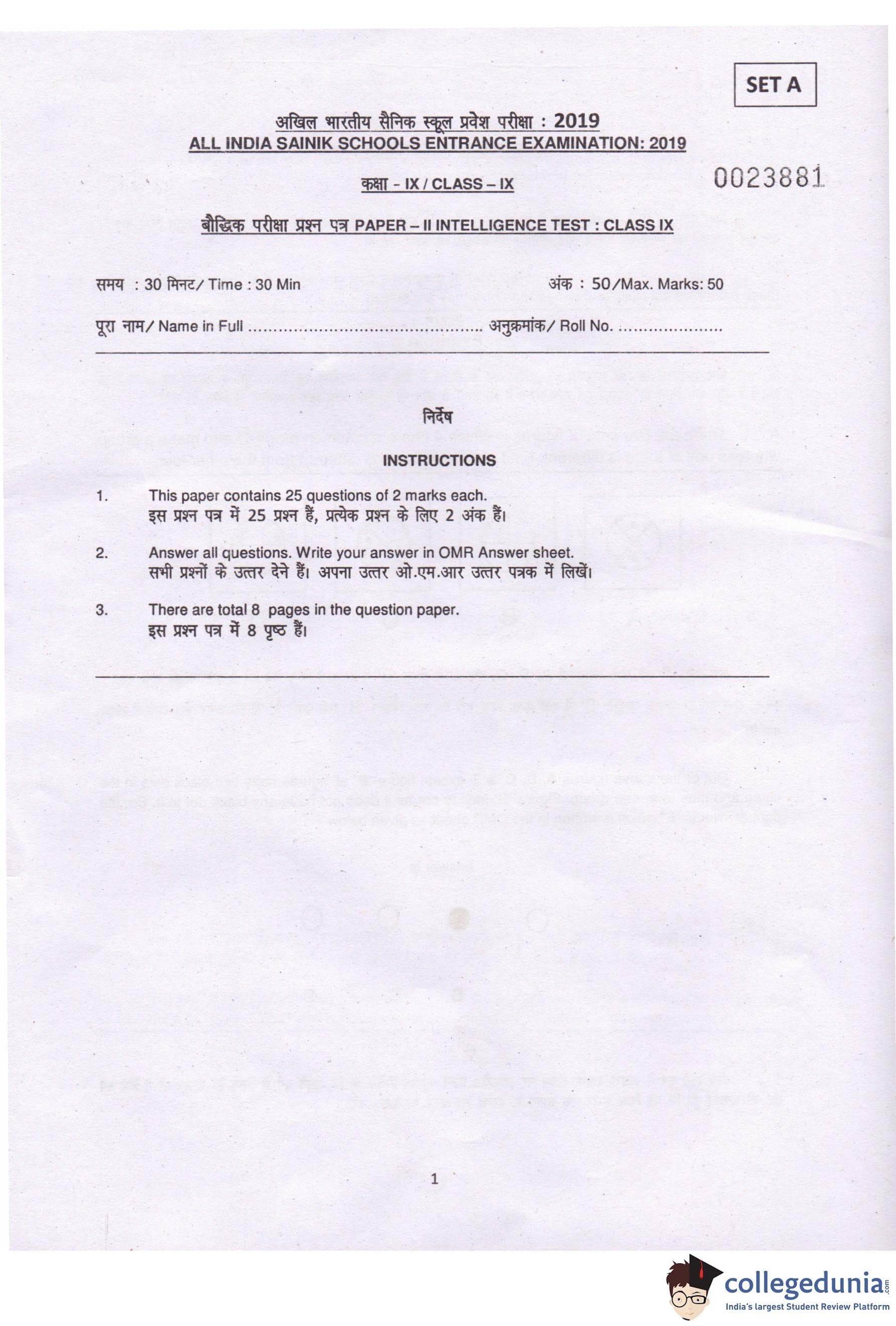 AISSEE 2019 Question Paper with Answer Key Class 9 (Set A)