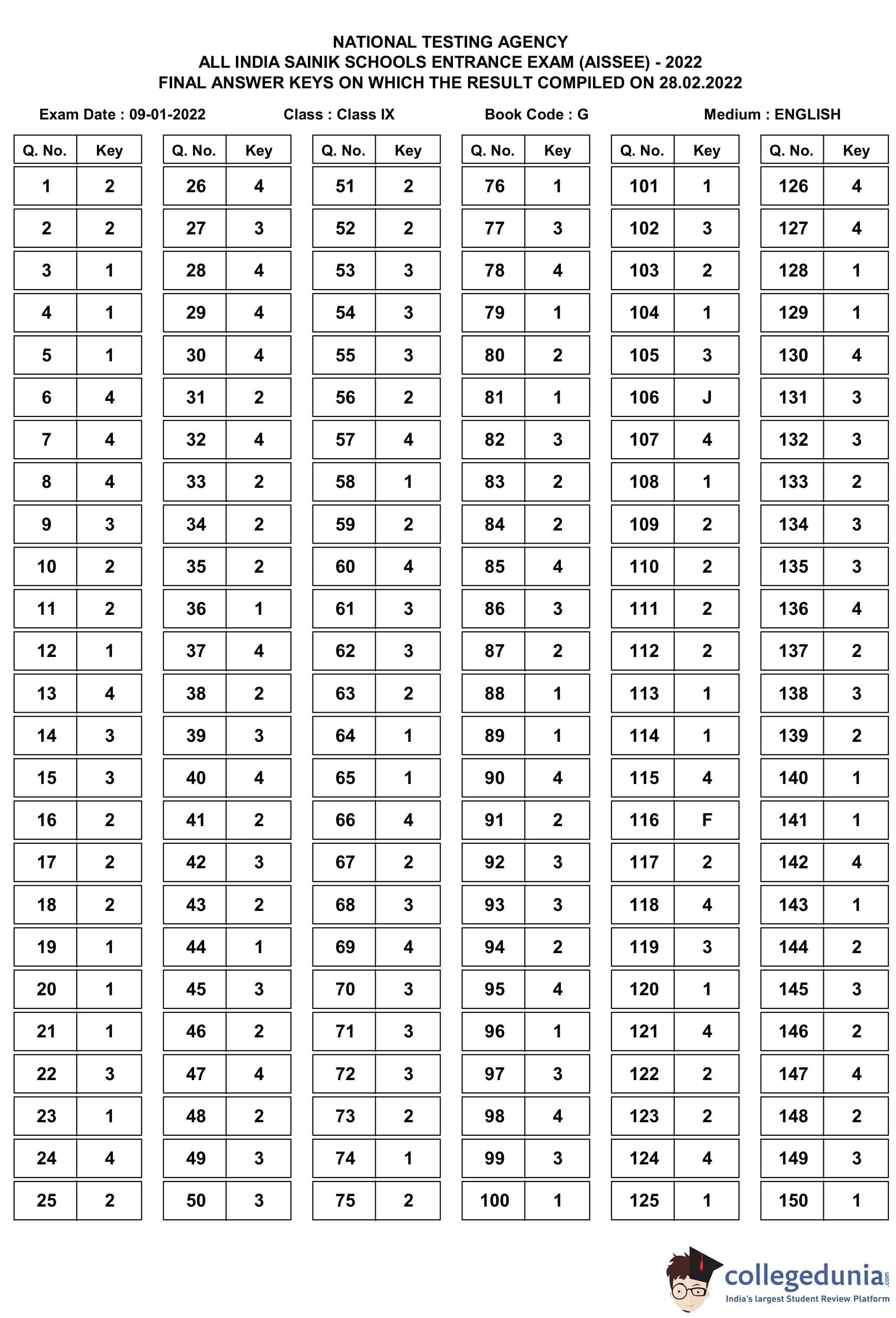 AISSEE 2022 Question Paper with Answer Key Class 9 (Set G) is available for download here. AISSEE 2023 was successfully conducted by National Testing Agency (NTA) on January 9, 2022. The question paper comprised a total of 150 questions divided among 5 sections.