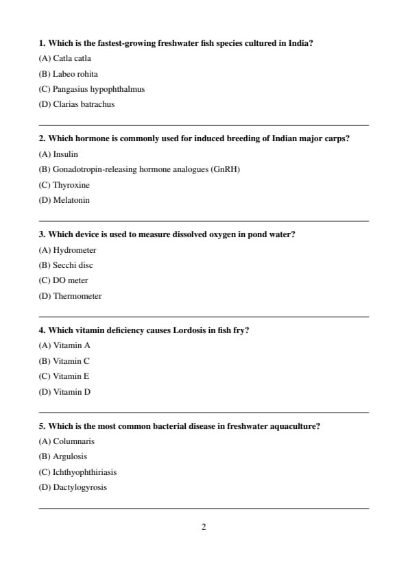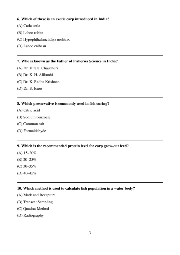 The exam evaluates candidates on their subject knowledge, practical skills, and analytical understanding. It consists of MCQ’s from topics related to fish breeding and genetics, aquaculture, fish nutrition, fishery resource management, fish health management, and other key areas of fisheries sciences.