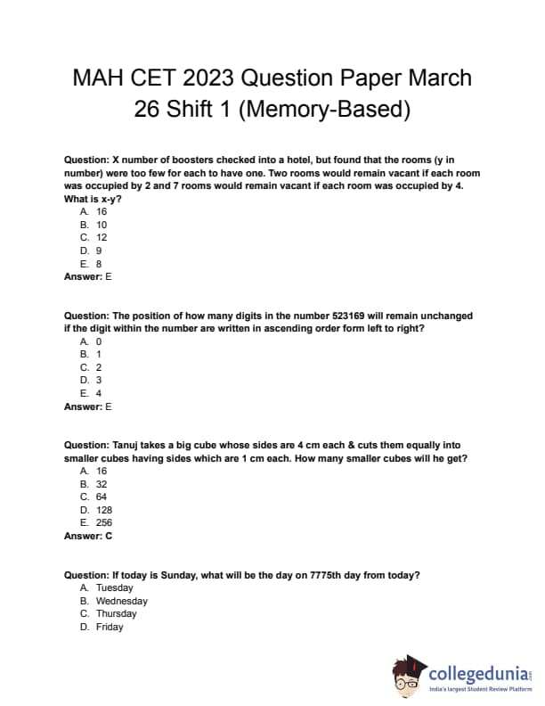 MAH CET 2023 Question Paper with Solutions PDF for the exams conducted in shift 1 and shift 2 on March 26 is now available here for download. MAH CET 2023 question paper (March 26, 2023) comprises 200 MCQs divided into 4 sections.