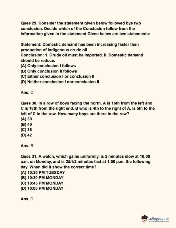 | 36. Consider the statement given below followed by two conclusions. Decide which of the conclusions follows from the information given in the statement: Statement: Domestic demand has been increasing faster than production of indigenous crude oil. Conclusions: I. Crude oil must be imported. II. Domestic demand should be reduced. (1) Only Conclusion I follows (2) Only Conclusion II follows (3) Either Conclusion I or II follows (4) Neither Conclusion I nor II follows |