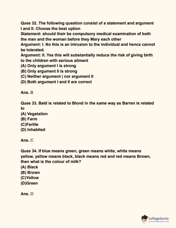 | 33. The following question consists of a statement and arguments I and II. Choose the best option: Statement: Should there be a compulsory medical examination of both the man and the woman before they marry each other? Arguments: I. No, this is an intrusion into the privacy of an individual and hence cannot be tolerated. II. Yes, this will substantially reduce the risk of giving birth to children with serious ailments. (1) Only Argument I is strong (2) Only Argument II is strong (3) Neither Argument I nor Argument II is strong (4) Both Argument I and Argument II are strong |