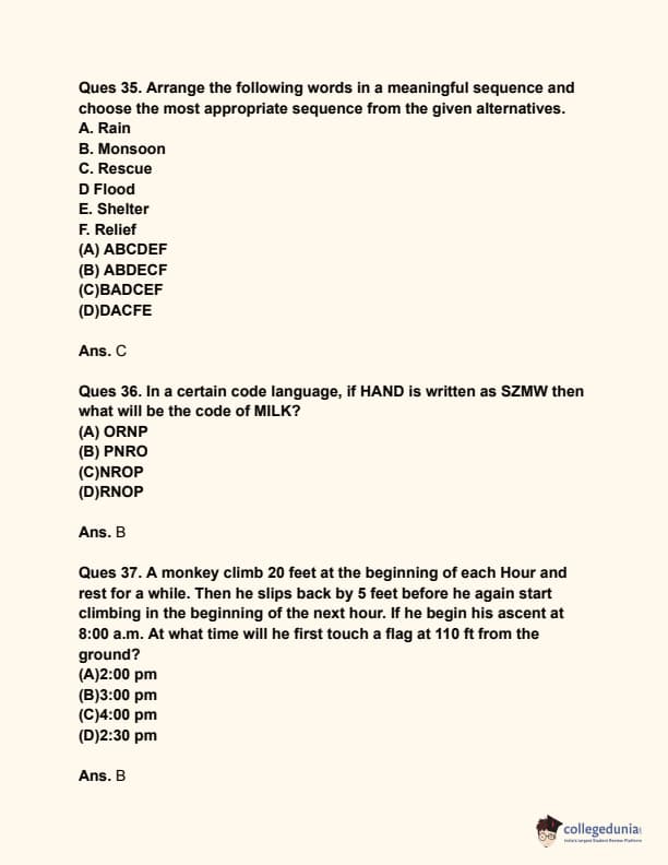 | 40. Arrange the following words in a meaningful sequence and choose the most appropriate sequence from the given alternatives: (A) Rain (B) Monsoon (C) Rescue (D) Flood (E) Shelter (F) Relief (1) (A), (B), (C), (D), (E), (F) (2) (A), (B), (D), (E), (C), (F) (3) (B), (A), (D), (C), (E), (F) (4) (D), (A), (B), (C), (F), (E) |