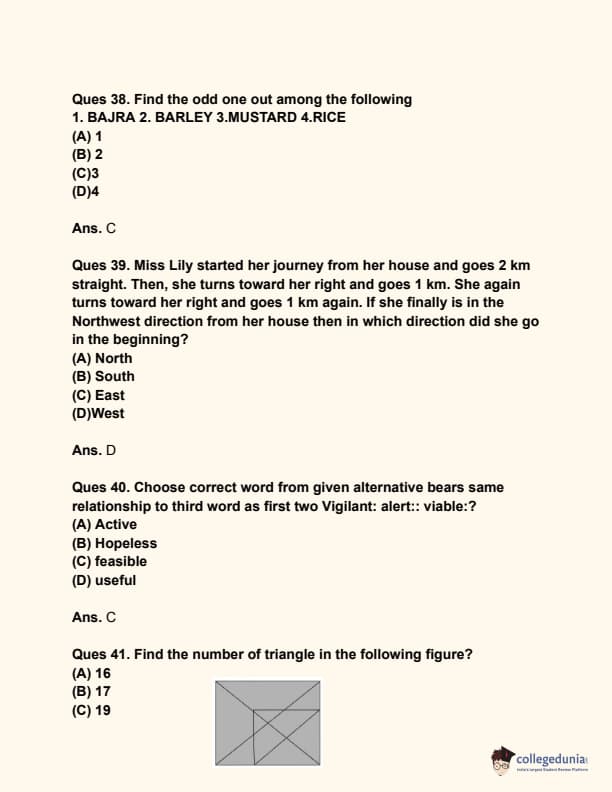 | 23. Choose the correct word from the given alternatives which bears the same relationship to the third word as the first two. Vigilant : Alert : : Viable : ? (1) Active (2) Hopeless (3) Feasible (4) Useful |