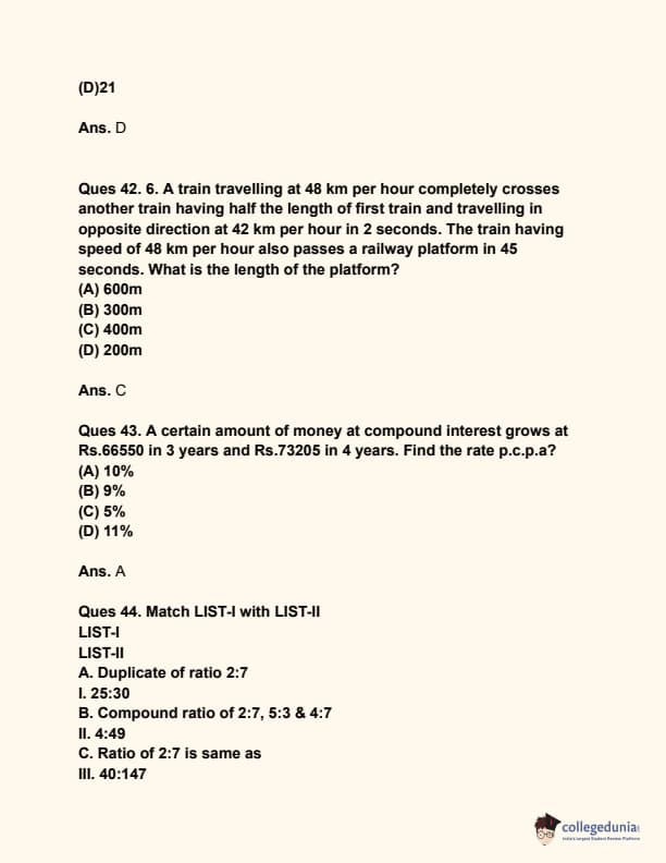 | 19. A train traveling at 48 km/h completely crosses another train having half the length of the first train and traveling in the opposite direction at 42 km/h in 12 seconds. The train traveling at 48 km/h also passes a railway platform in 45 seconds. What is the length of the platform? (1) 600 m (2) 300 m (3) 400 m (4) 200 m |