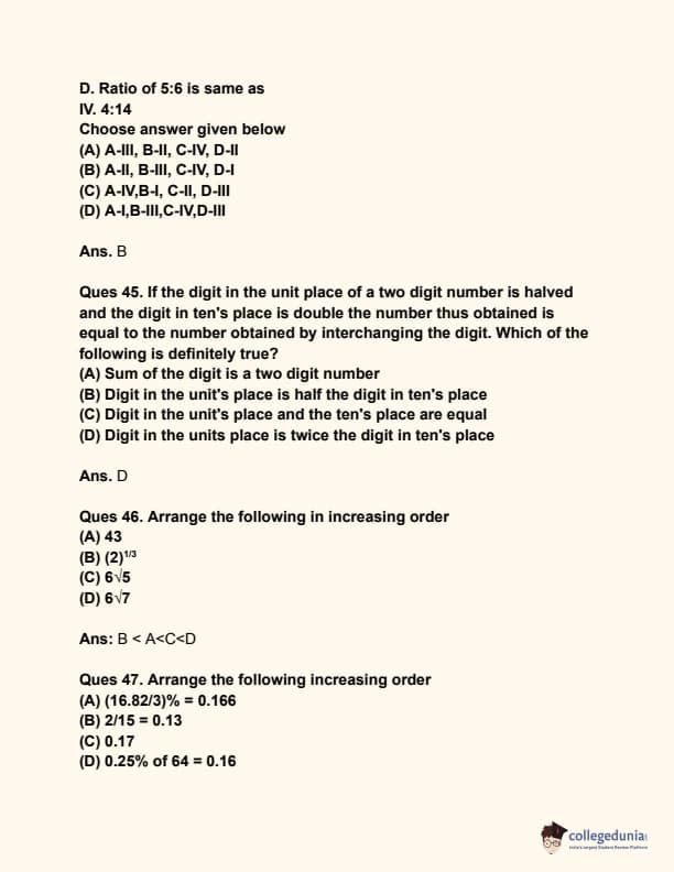 | 13. Arrange the following in increasing order: (A) 16 2/3% (B) 2/15 (C) 0.17 (D) 0.25% of 64 (1) B < D < A < C (2) A < D < B < C (3) C < D < B < A (4) A < C < D < B |