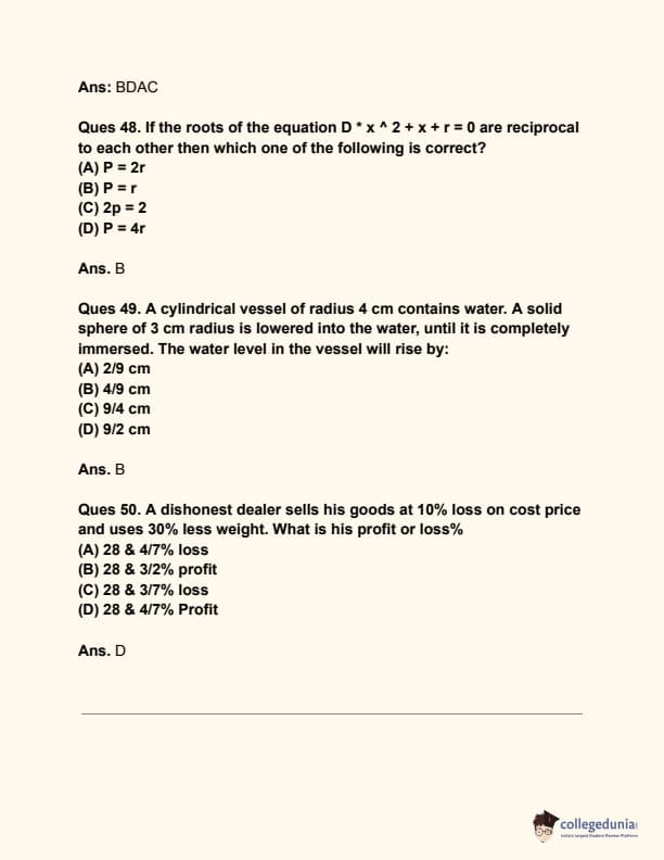 | 14. A dishonest dealer sells his goods at 10% loss on cost price and uses 30% less weight. What is his profit or loss percentage? (1) 28 4/7% loss (2) 28 3/7% profit (3) 28 3/7% loss (4) 28 4/7% profit |