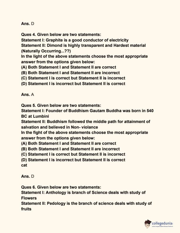 (2) Both Statement I and Statement II are false | Both statements are incorrect. Anthology refers to a collection of literary works, not the study of flowers. Pedology is the scientific study of soils in their natural environment, not fruits. | ||||||||||