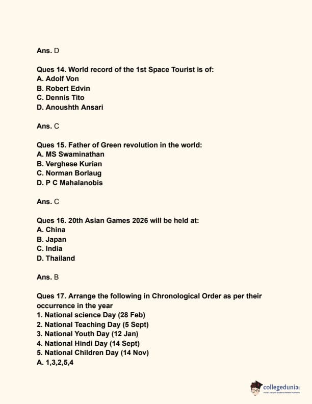 (3) (C), (A), (B), (D), (E) | National Youth Day (January 12), National Science Day (February 28), National Teacher's Day (September 5), National Hindi Day (September 14), National Children's Day (November 14). | ||||||||||