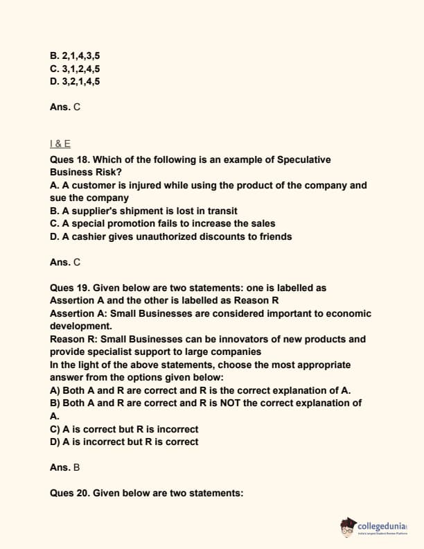 | 95. Which of the following is an example of speculative business risk? (1) A customer is injured while using the product and sues the company (2) A supplier's shipment is lost in transit (3) A special promotion fails to increase the sales (4) A cashier gives unauthorized discounts to friends |