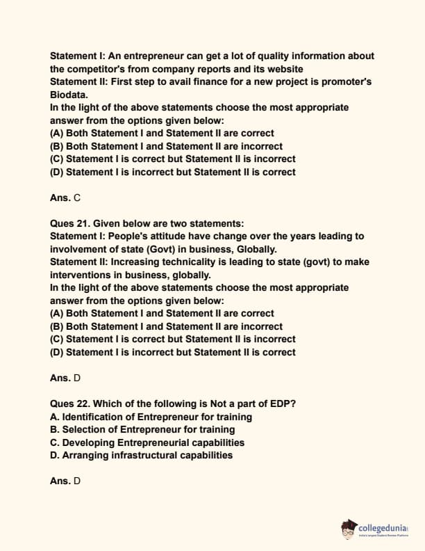 (3) Statement I is true but Statement II is false | Entrepreneurs can analyze competitors through reports and websites. However, the first step to financing a new project is submitting a business plan, not the Promoter's Biodata. | ||||||||||