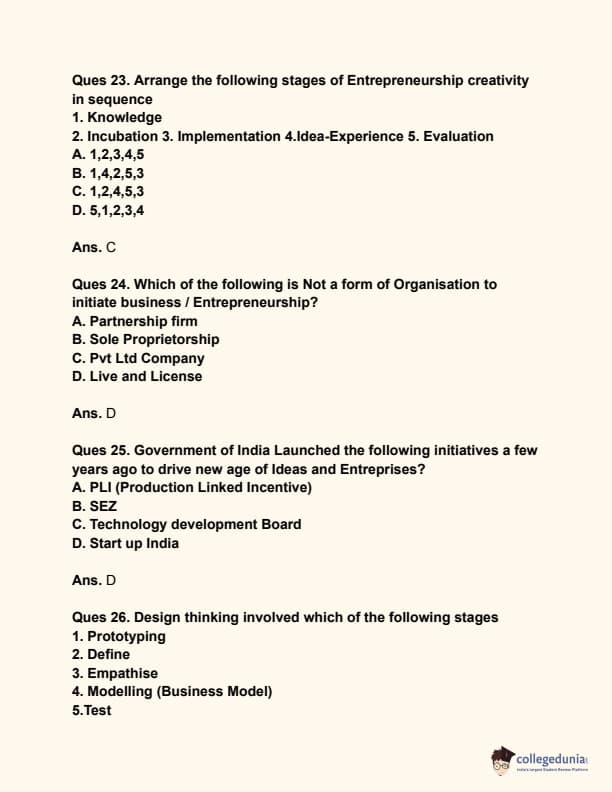 | 88. Arrange the following stages of Entrepreneurship Creativity in sequence: (A) Knowledge accumulation (B) Incubation (C) Implementation (D) Idea experience (E) Evaluation Options: (1) (A), (B), (C), (D), (E) (2) (A), (D), (B), (E), (C) (3) (A), (B), (D), (E), (C) (4) (E), (A), (B), (C), (D) |