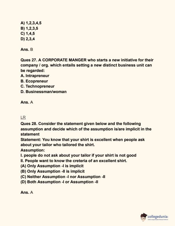 | 35. Consider the statement given below and the following assumptions and decide which of the assumptions is/are implicit in the statement: Statement: You know that your shirt is excellent when people ask about your tailor who tailored the shirt. Assumptions: I. People do not ask about your tailor if your shirt is not good. II. People want to know the criteria of an excellent shirt. (1) Only Assumption I is implicit (2) Only Assumption II is implicit (3) Neither Assumption I nor II is implicit (4) Both Assumptions I and II are implicit |