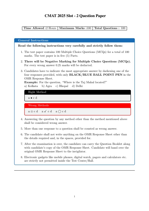 CMAT 2025 Slot 2 Question Paper with Solutions PDF is available for download here. CMAT 2025 Slot 2 question paper consists of 100 multiple-choice questions divided equally into 5 sections. Each question in CMAT 2025 question paper is worth 4 marks. Candidates can download CMAT 2025 question paper with solutions pdf for Slot exam using the links given below.