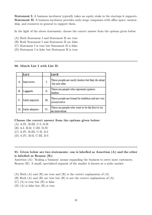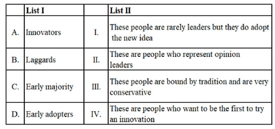 - Early Majority adopts new ideas after the innovators, but they need to see that others have adopted it. They are opinion leaders but not the first to act. Hence, C matches with II.