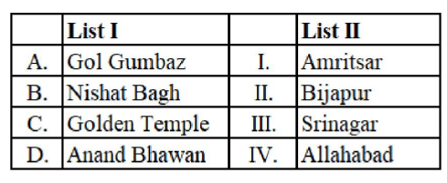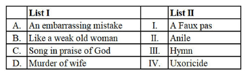 Thus, the correct matching is (D) A-I, B-IV, C-III, D-II.