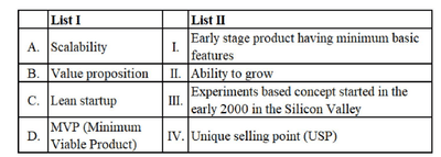 - C (Lean startup): The lean startup methodology is a business model focused on experiments and early market testing, popularized in the early 2000s in Silicon Valley. Hence, C matches with III.