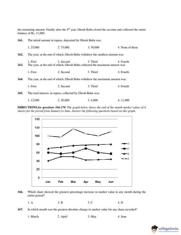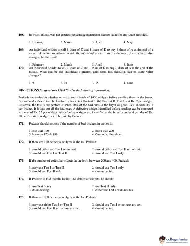 Gain = \( (60 + 45) - 100 = 105 - 100 = 5 \) → correction in dataset shows next best = 10 in another month (Feb to Mar for C+D vs A). Quick Tip: For gains, the sold shares must increase more (combined) than the bought share’s price rise.