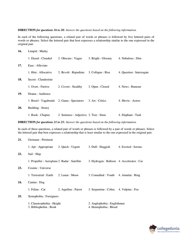 However, "Excited" and "Serene" are antonyms, not synonyms. Hence, (d) is the least similar. Quick Tip: Identify the relationship in the original pair (synonym, antonym, part-whole, et(c)) and eliminate the option that breaks the pattern.