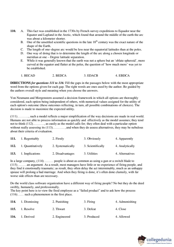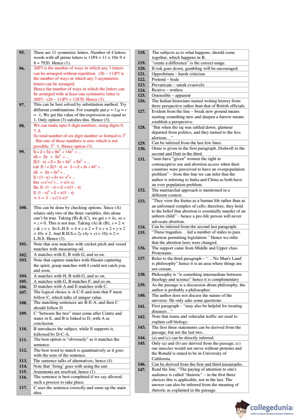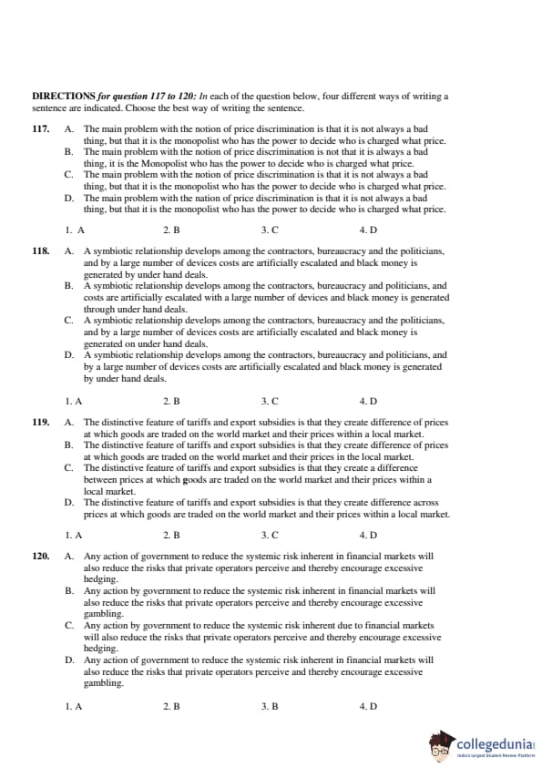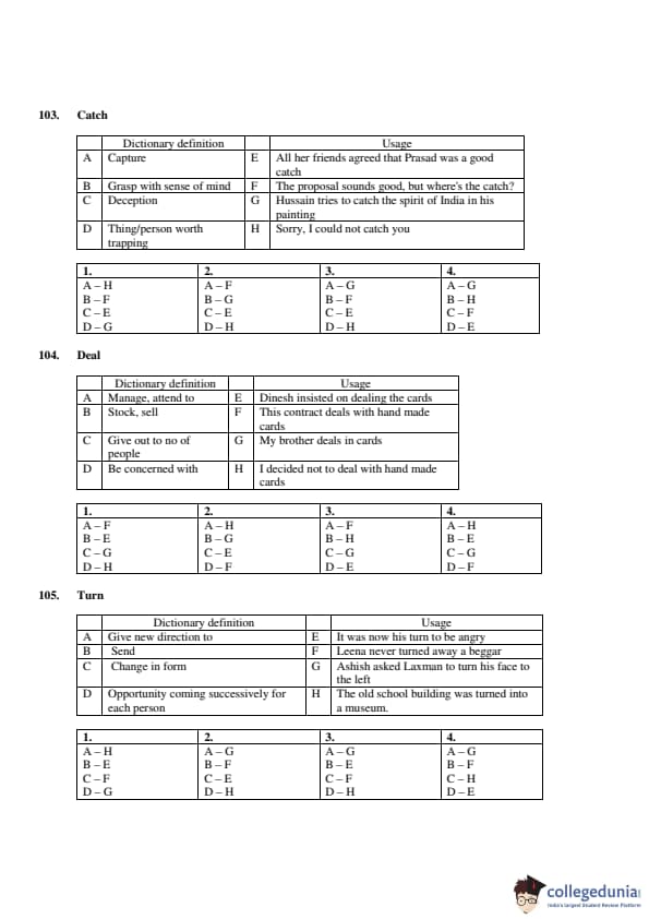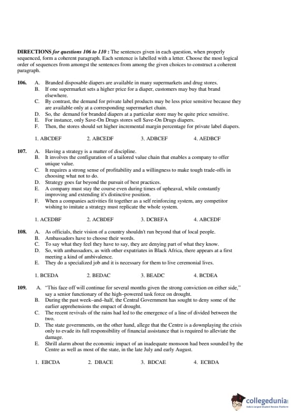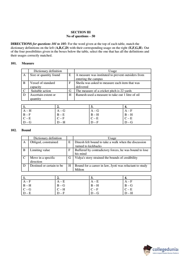- VA- 5 questions on synonyms (of identified words in sentences), 6 questions in cloze passage (fill the blanks in paragraphs), 4 questions on sentence improvement, 5 questions on paragraph formation, and 5 questions on word usage.