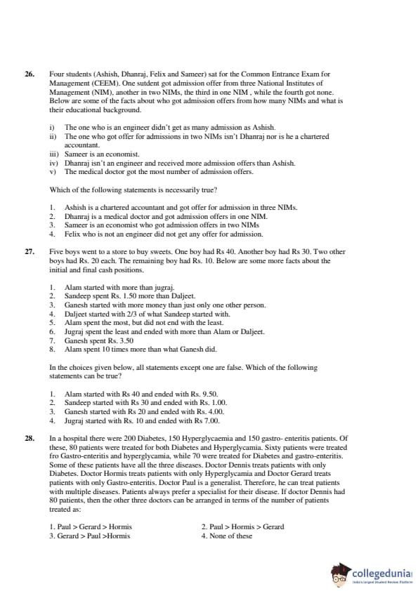 In a hospital there were 200 diabetes, 150 hyperglycaemia and 150 gastro-enteritis patients. Of these, 80 patients were treated for both diabetes and hyperglycaemia. Sixty patients were treated for gastro-enteritis and hyperglycaemia, while 70 were treated for diabetes and gastro-enteritis. Some of these patients have all the three diseases. Dr. Dennis treats patients with only gastro-enteritis. Dr. Paul is a generalist. Therefore, he can treat patients with multiple diseases. Patients always prefer a specialist for their disease. If Dr. Dennis had 80 patients, then the other three doctors can be arranged in terms of the number of patients treated as: