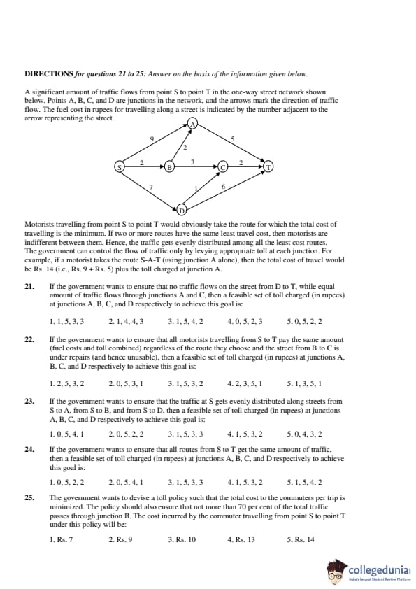 If the government wants to ensure that no traffic flows on the street from D to T, while equal amount of traffic flows through junctions A and C, then a feasible set of toll charged (in rupees) at junctions A, B, C, and D respectively to achieve this goal is: