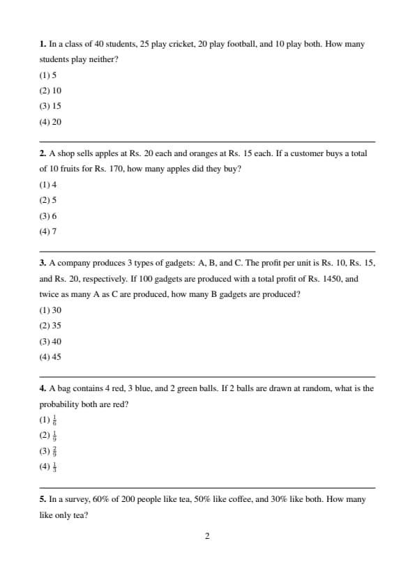 Quick Tip: For set problems, use inclusion-exclusion: \(|A \cup B| = |A| + |B| - |A \cap B|\) to find students in at least one set, then subtract from total for neither.