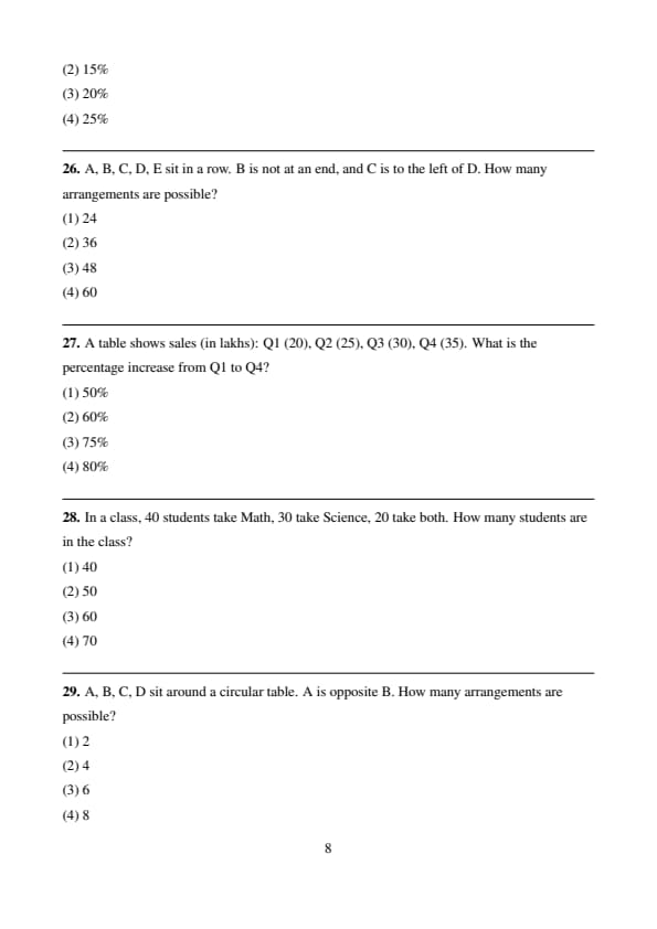 A table shows sales (in lakhs): Q1 (20), Q2 (25), Q3 (30), Q4 (35). What is the percentage increase from Q1 to Q4?