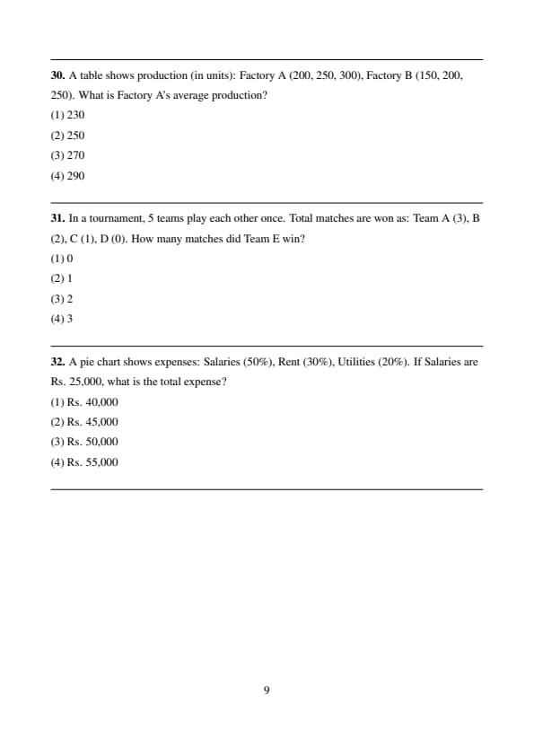 A pie chart shows expenses: Salaries (50%), Rent (30%), Utilities (20%). If Salaries are Rs. 25,000, what is the total expense?