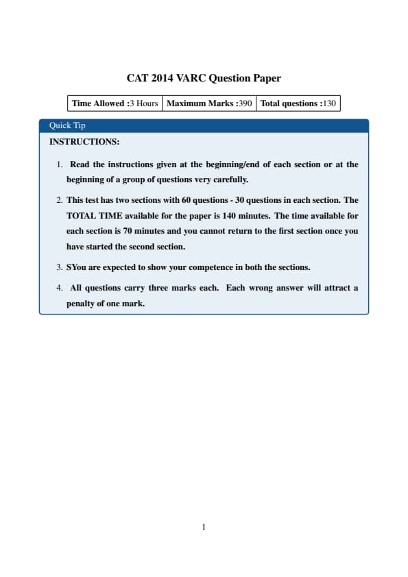 | CAT 2014 Question Paper With Answer Key – VARC Slot 1 | Check Solutions |