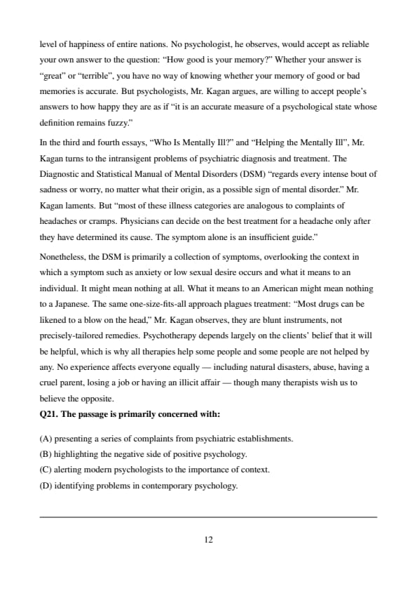 The passage, based on Mr. Kagan’s essays, critiques various aspects of current psychology — from measurement issues to psychiatric diagnosis and treatment. It identifies problems such as overreliance on subjective measures, ignoring context, and the limitations of the DSM. Therefore, the most accurate answer is (D).