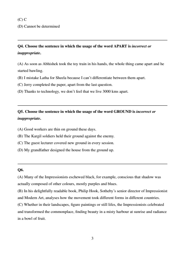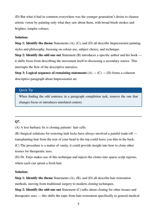 (A) → (C) → (D) forms a coherent descriptive paragraph about Impressionist art. Quick Tip: When finding the odd sentence in a paragraph completion task, remove the one that changes focus or introduces unrelated context.