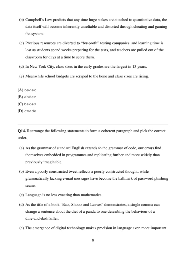 CAT 2014 Question Paper had 50 questions from the Verbal Ability and Logical Reasoning section.