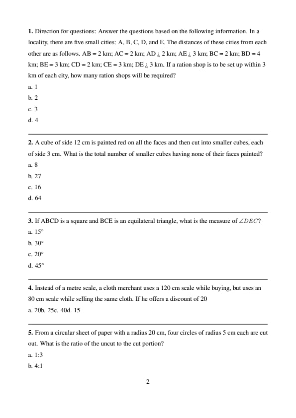 Direction for questions: Answer the questions based on the following information. In a locality, there are five small cities: A, B, C, D, and E. The distances of these cities from each other are as follows. AB = 2 km; AC = 2 km; AD > 2 km; AE > 3 km; BC = 2 km; BD = 4 km; BE = 3 km; CD = 2 km; CE = 3 km; DE > 3 km. If a ration shop is to be set up within 3 km of each city, how many ration shops will be required?