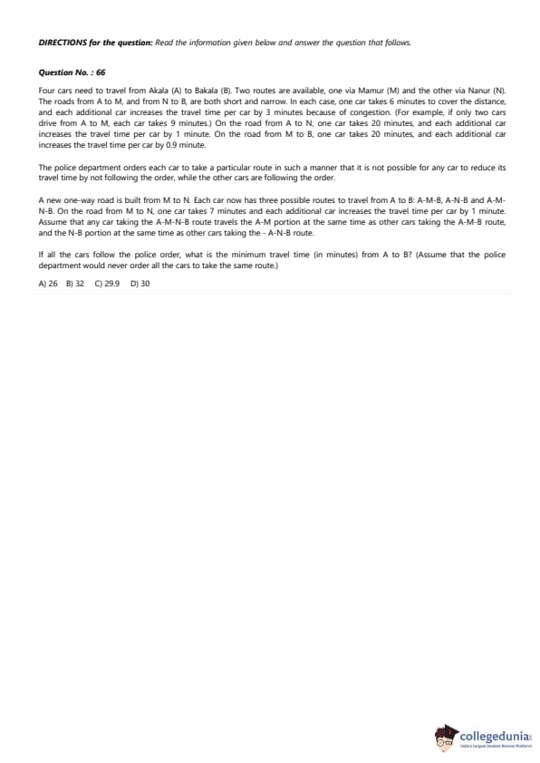 Four cars need to travel from Akala (A) to Bakala (B). Two routes are available, one via Mamur (M) and the other via Nanur (N). The roads from A to M, and from N to B, are both short and narrow. In each case, one car takes 6 minutes to cover the distance, and each additional car increases the travel time per car by 3 minutes because of congestion. (For example, if only two cars drive from A to M, each car takes 9 minutes.) On the road from A to N, one car takes 20 minutes, and each additional car increases the travel time per car by 1 minute. On the road from M to B, one car takes 20 minutes, and each additional car increases the travel time per car by 0.9 minute.