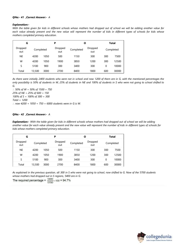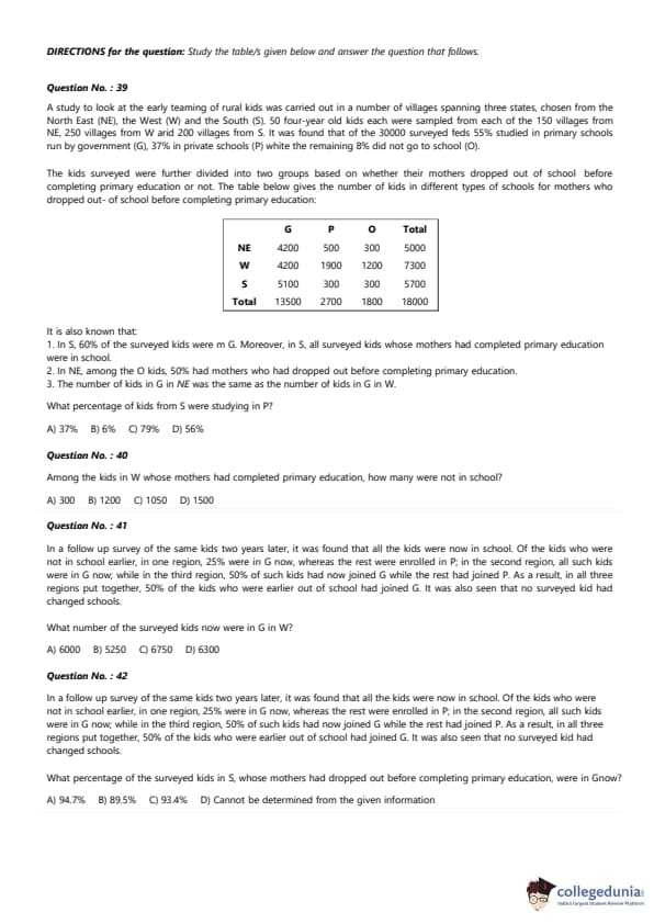 0 four-year old kids each were sampled from each of the 150 villages from NE, 250 villages 5 from W, and 200 villages from S. It was found that of the 30,000 surveyed kids, 55% studied in primary schools run by government (G), 37% in private schools (P) while the remaining 8% did not go to school (O). The kids surveyed were further divided into two groups based on whether their mothers dropped out of school before completing primary education or not. The table below gives the number of kids in different types of schools for mothers who dropped out of school before completing primary education: