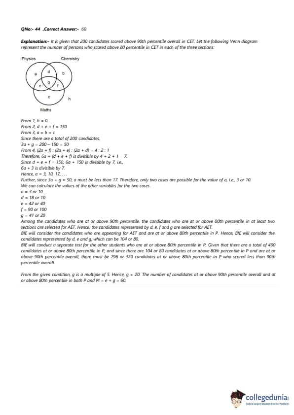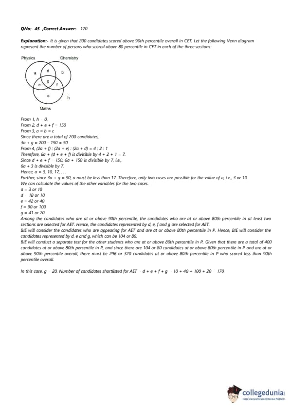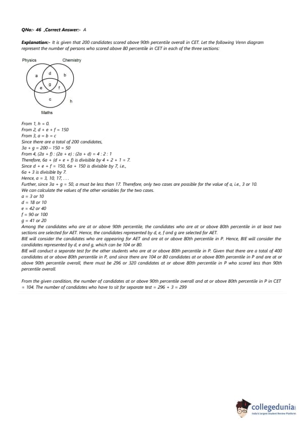 For the 200 candidates who are at or above the 90th percentile overall based on CET, the following are known about their performance in CET: 1. No one is below the 80th percentile in all 3 sections. 2. 150 are at or above the 80th percentile in exactly two sections. 3. The number of candidates at or above the 80th percentile only in P is the same as the number of candidates at or above the 80th percentile only in C. The same is the number of candidates at or above the 80th percentile only in M. 4. Number of candidates below 80th percentile in P: Number of candidates below 80th percentile in C: Number of candidates below 80th percentile in M = 4:2:1. BIE uses a different process for selection. If any candidate is appearing in the AET by AIE, BIE considers their AET score for final selection provided the candidate is at or above the 80th percentile in P. Any other candidate at or above the 80th percentile in P in CET, but who is not eligible for the AET, is required to appear in a separate test to be conducted by BIE for being considered for final selection. Altogether, there are 400 candidates this year who are at or above the 80th percentile in P.What best can be concluded about the number of candidates sitting for the separate test for BIE who were at or above the 90th percentile overall in CET?