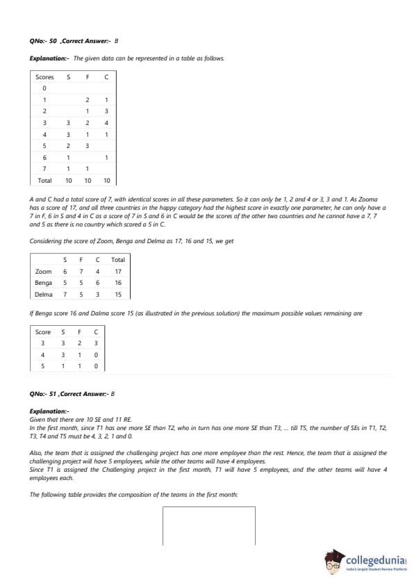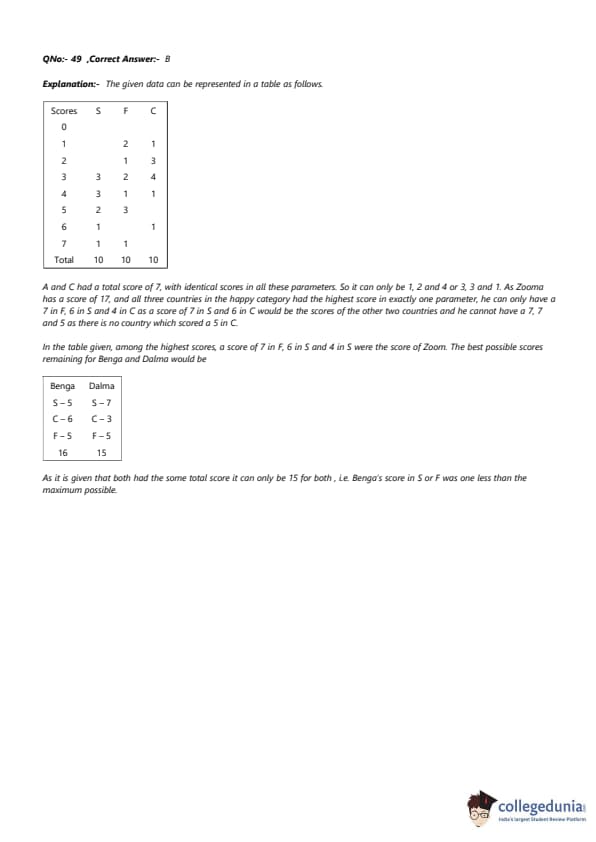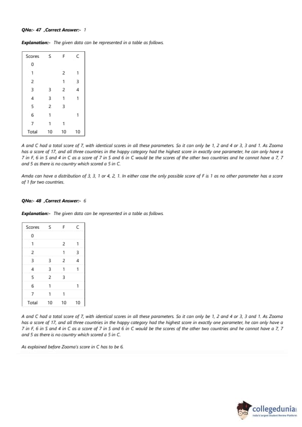 Amda can have a distribution of 3, 3, 1 or 4, 2, 1. In either case, the only possible score of F is 1 as no other parameter has a score of 1 for two countries. Quick Tip: When the total score is given and the scores in each parameter are identical, simply divide the total score by 3 to find the score for each parameter. If the result is not an integer, round to the nearest valid integer.