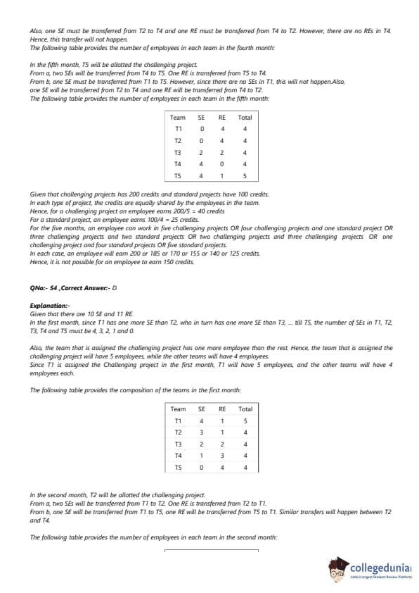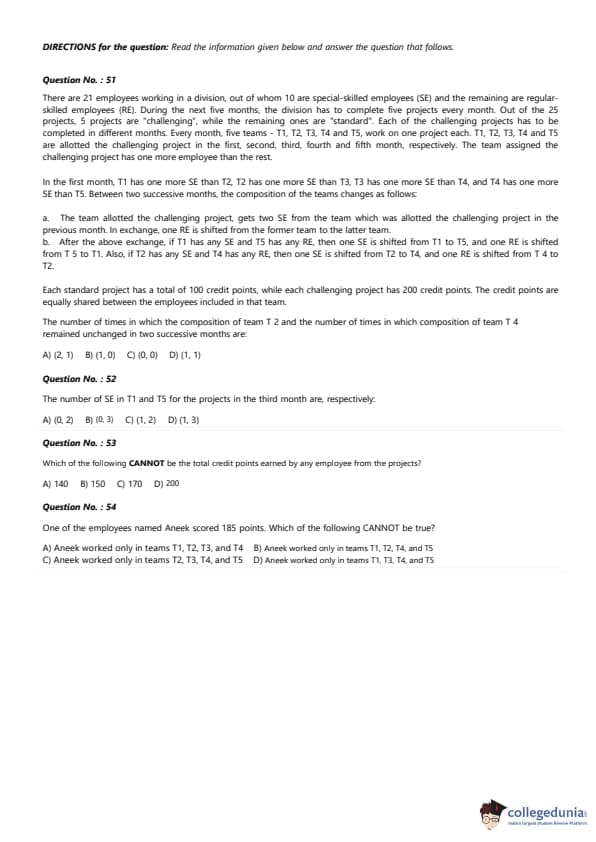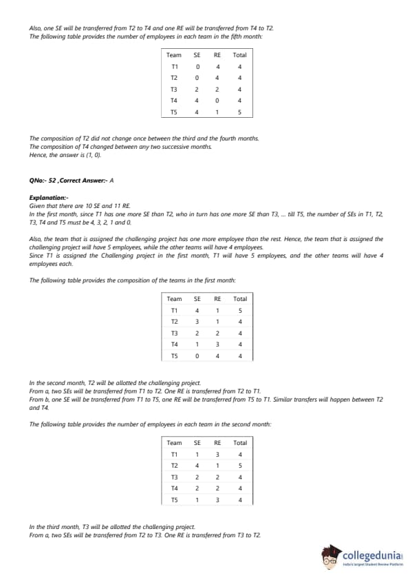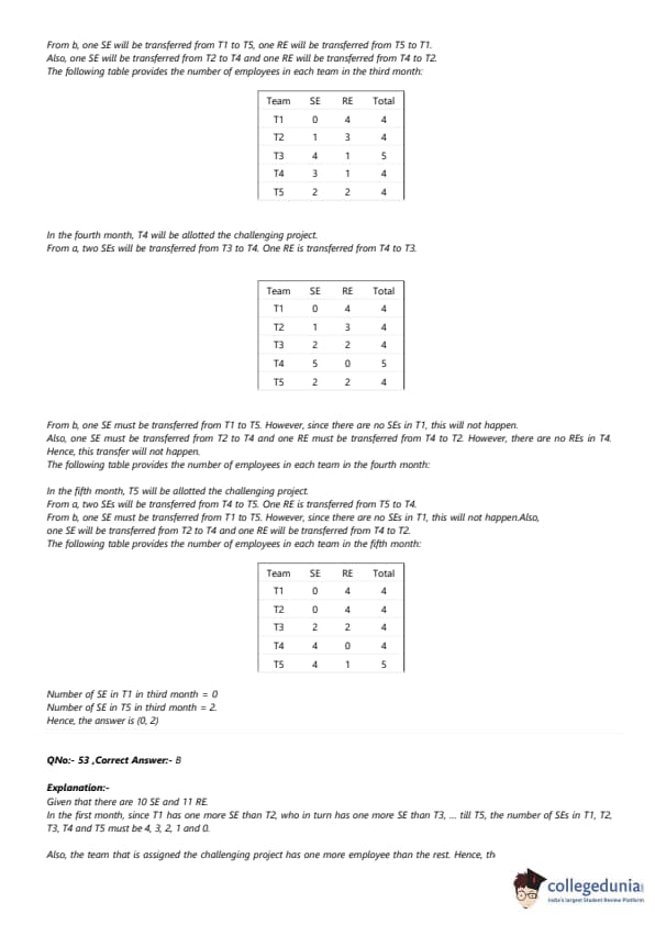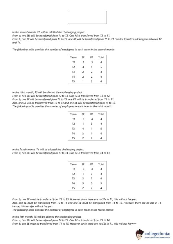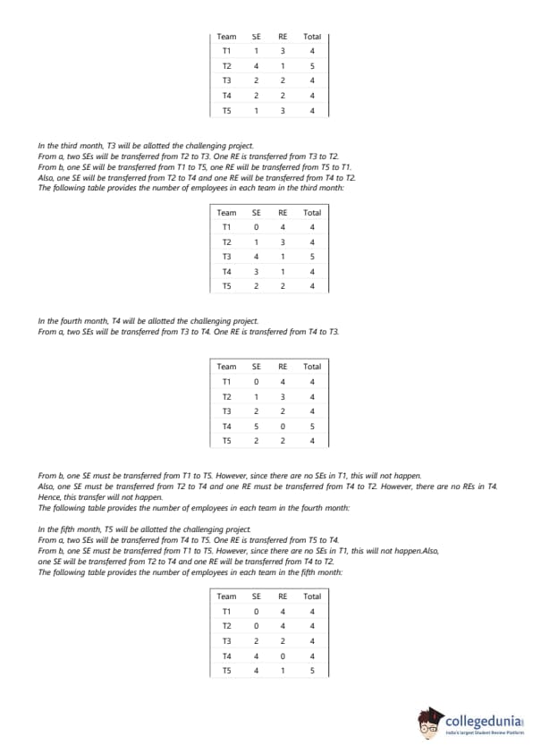 ach of the challenging projects has to be completed in different months. Every month, five teams - T1, T2, T3, T4, and T5, work on one project each. T1, T2, T3, T4, and T5 are allotted the challenging project in the first, second, third, fourth, and fifth month, respectively. The team assigned the challenging project has one more employee than the rest. In the first month, T1 has one more SE than T2, 25 T2 has one more SE than T3, T3 has one more SE than T4, and T4 has one more SE than T5. Between two successive months, the composition of the teams changes as follows: 1. The team allotted the challenging project gets two SE from the team which was allotted the challenging project in the previous month. In exchange, one RE is shifted from the former team to the latter team. 2. After the above exchange, if T1 has any SE and T5 has any RE, then one SE is shifted from T1 to T5, and one RE is shifted from T5 to T1. Also, if T2 has any SE and T4 has any RE, then one SE is shifted from T2 to T4, and one RE is shifted from T4 to T2. Each standard project has a total of 100 credit points, while each challenging project has 200 credit points. The credit points are equally shared between the employees included in that team.The number of times in which the composition of team T2 and the number of times in which composition of team T4 remained unchanged in two successive months are: