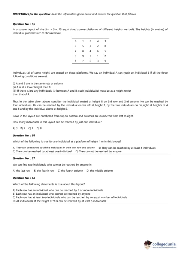 Individuals (all of same height) are seated on these platforms. We say an individual A can reach an individual B if all the three following conditions are met: (i) A and B are in the same row or column. (ii) A is at a lower height than B. (iii) If there is/are any individual(s) between A and B, such individual(s) must be at a height lower than that of A. Thus in the table given above, consider the individual seated at height 8 on the 3rd row and 2nd column. He can be reached by four individuals. He can be reached by the individual on his left at height 7, by the two individuals on his right at heights of 4 and 6, and by the 30 individual above at height 5. Rows in the layout are numbered from top to bottom and columns are numbered from left to right.