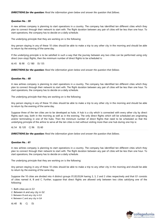 Suppose three of the ten cities are to be developed as hubs. A hub is a city which is connected with every other city by direct flights each way, both in the morning as well as in the evening. The only direct flights which will be scheduled are originating and/or terminating in one of the hubs. Then the minimum number of direct flights that need to be scheduled so that the underlying principle of the airline to serve all the ten cities is met without visiting more than one hub during one trip is: