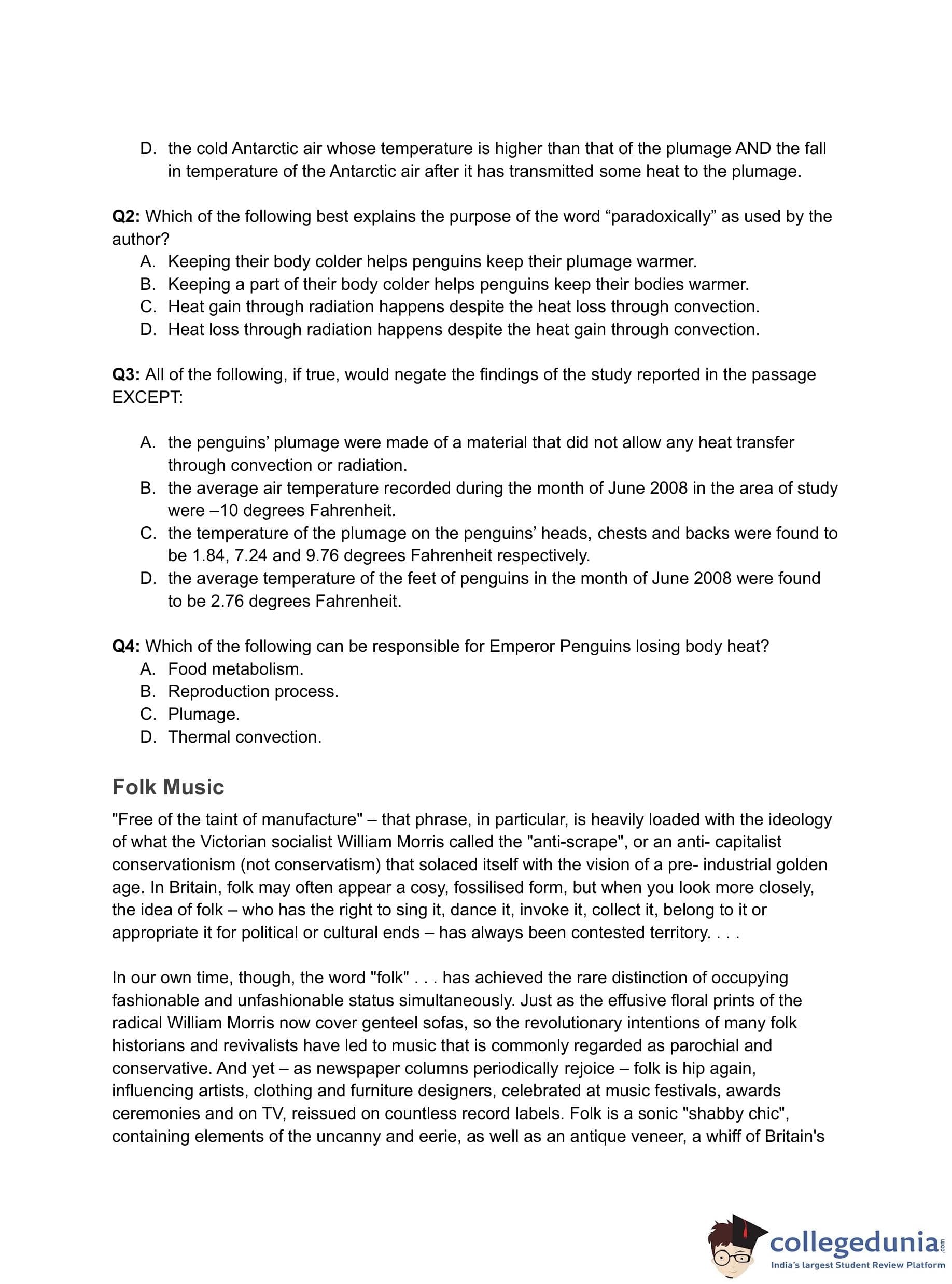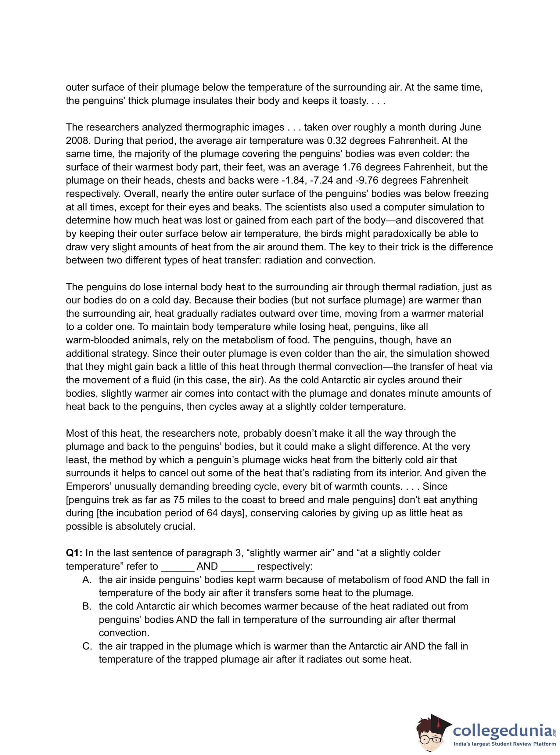 - (A) Keeping their body colder helps penguins keep their plumage warmer.