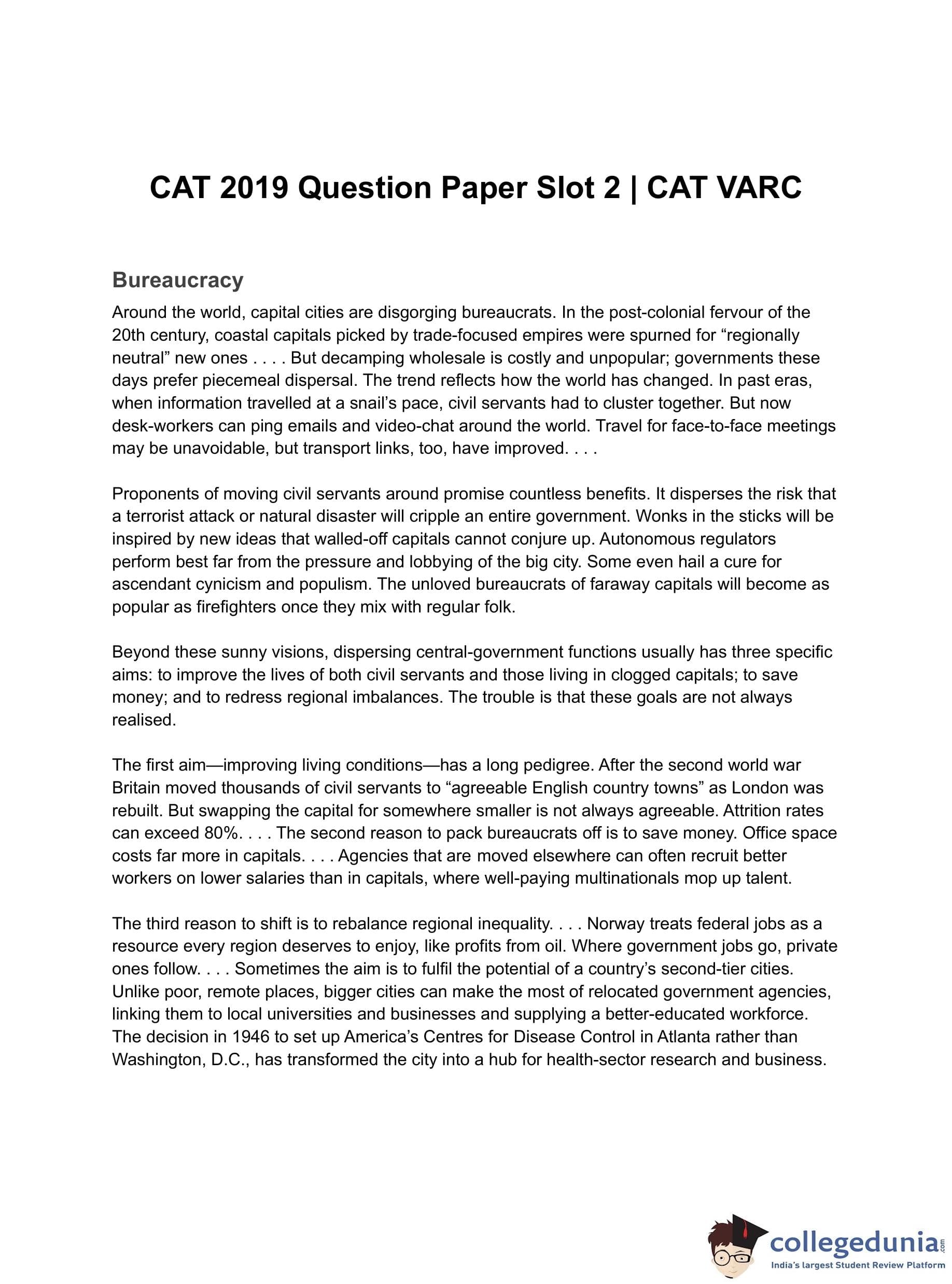 CAT 2019 VARC Question Paper for November 24 Slot 2 was rated moderate to difficult by the test-takers and experts alike. In CAT 2019 Slot 2 VARC paper, there were 5 RCs out of which 2 were more difficult to comprehend. 99 percentile in the section could be achieveAspirants of CAT can download CAT 2019 VARC Slot 2 Question Paper with Solution PDFs from the links below.d by scoring around 60 to 62 marks.
