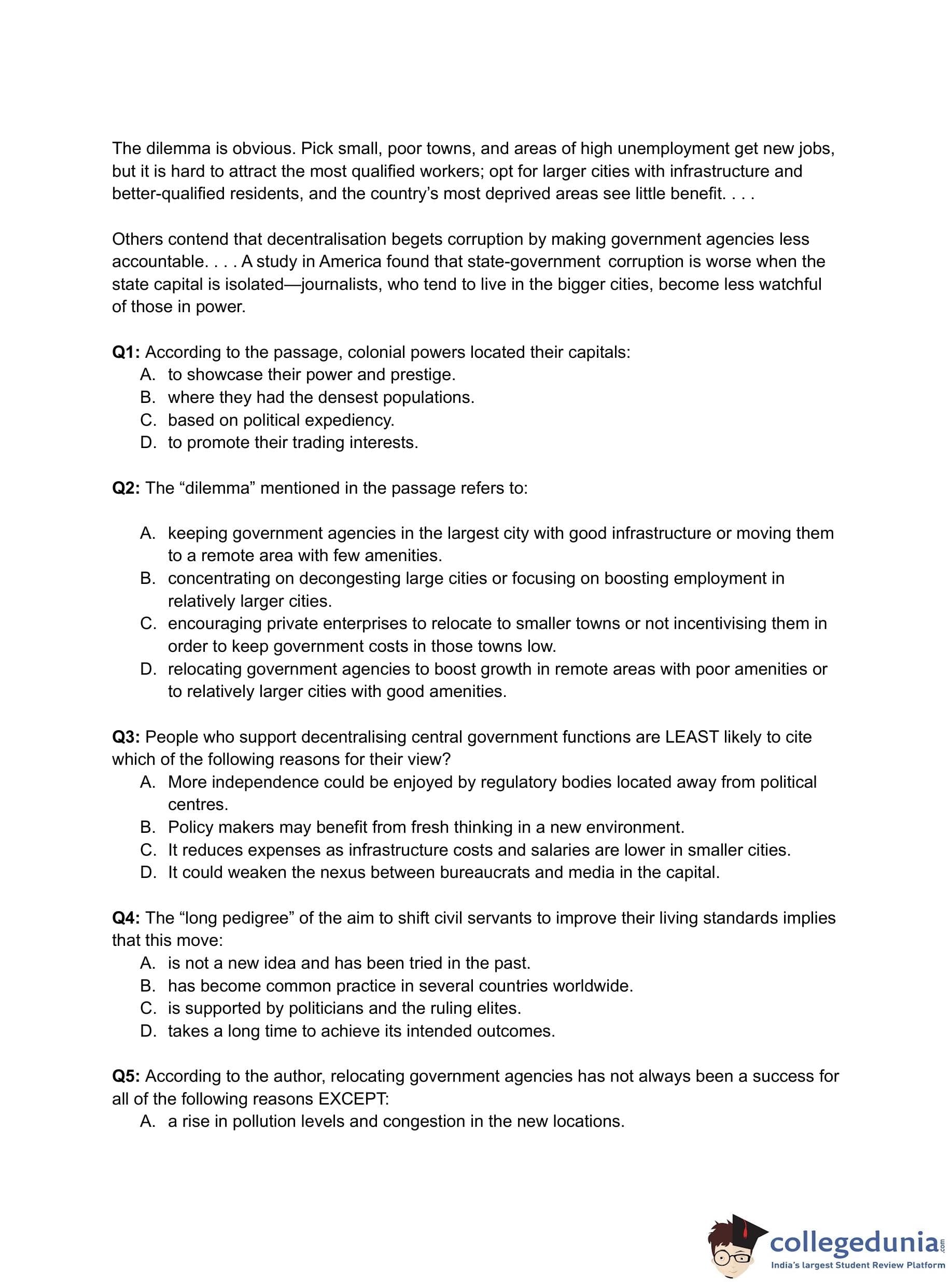 - (A) keeping government agencies in the largest city with good infrastructure or moving them to a remote area with few amenities.