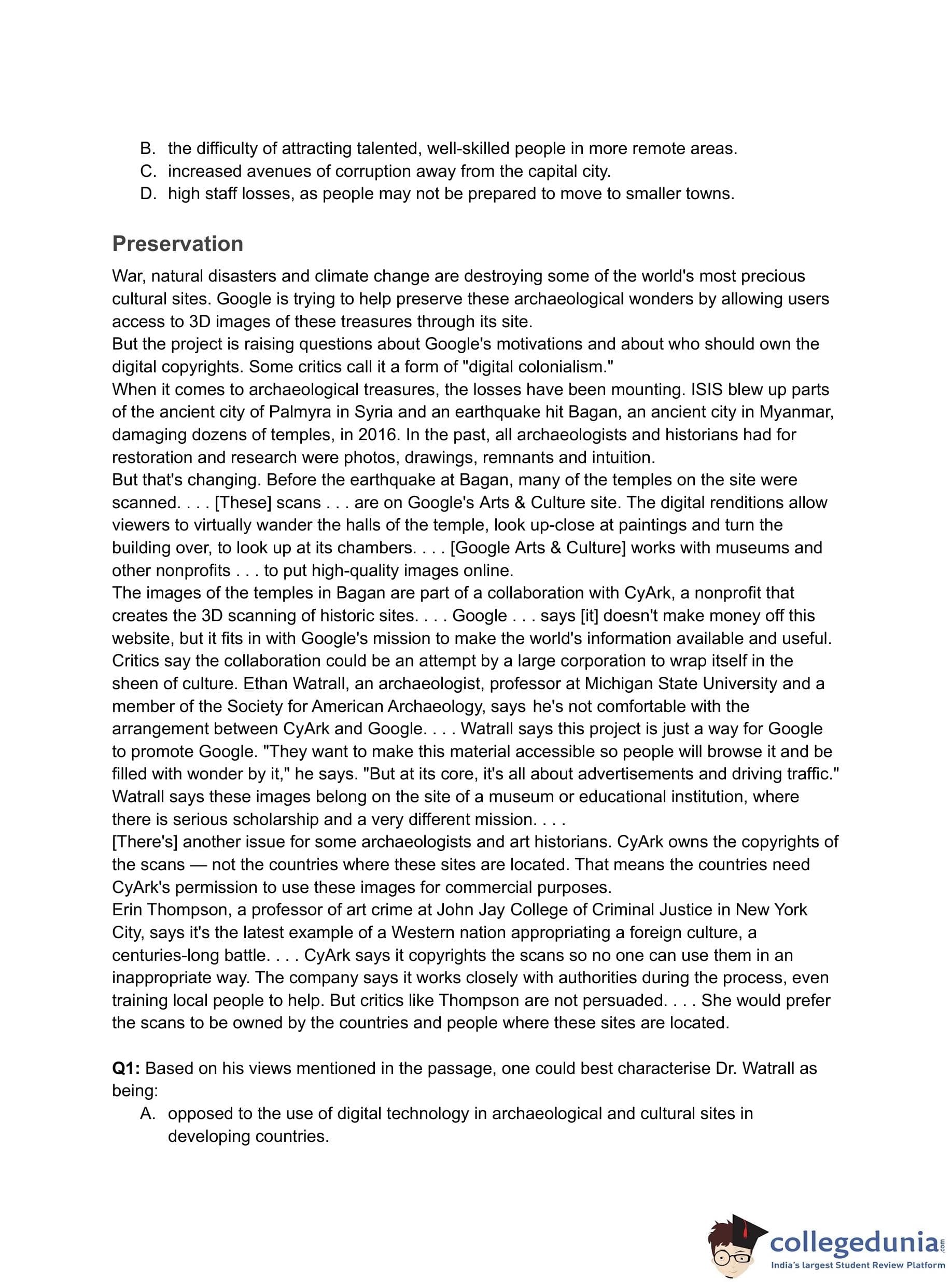 Correct Answer: (C) uneasy about the marketing of archaeological images for commercial use by firms such as Google and CyArk.