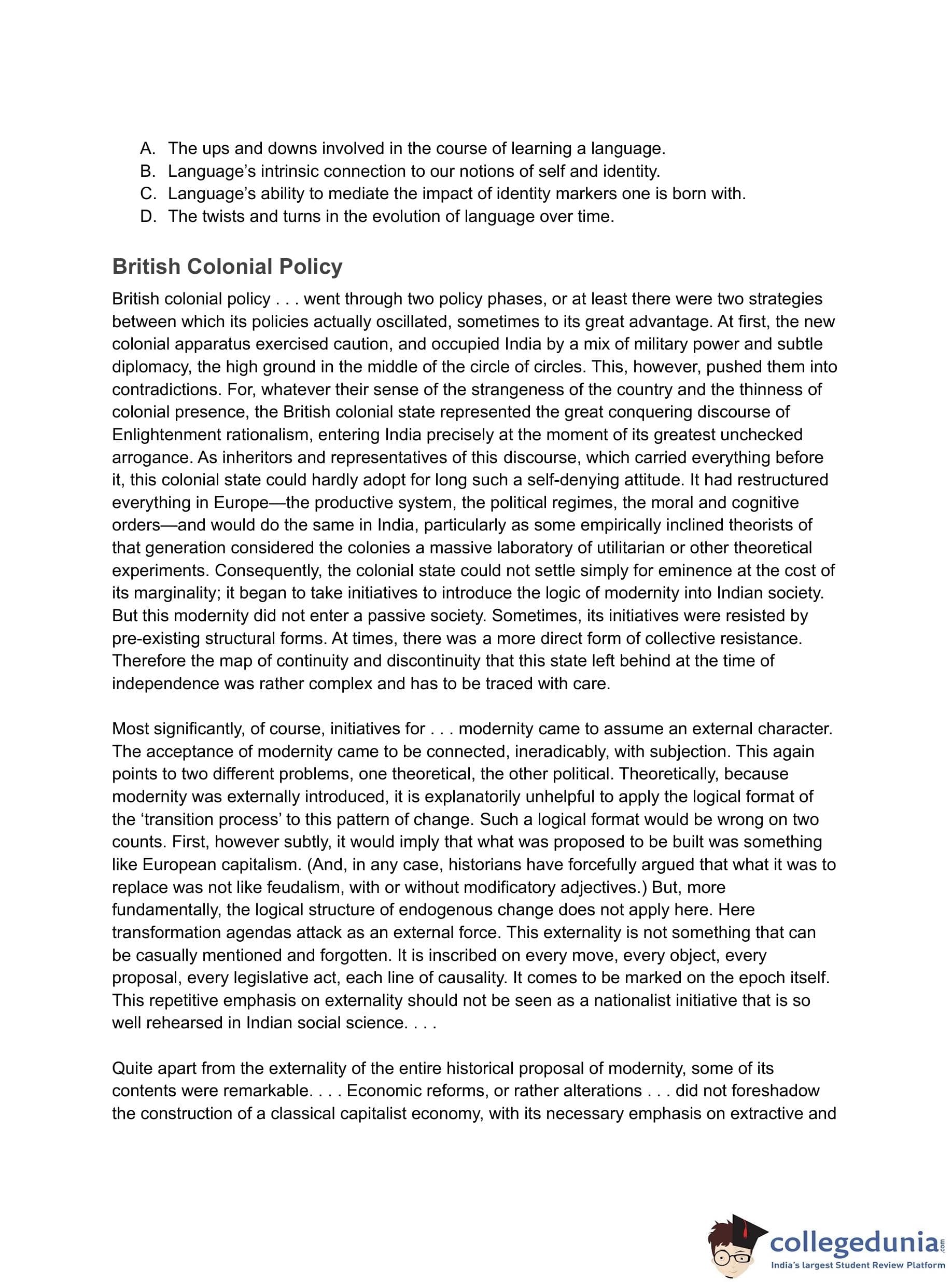 - (D) the change in British colonial policy was induced by resistance to modernity in Indian society.