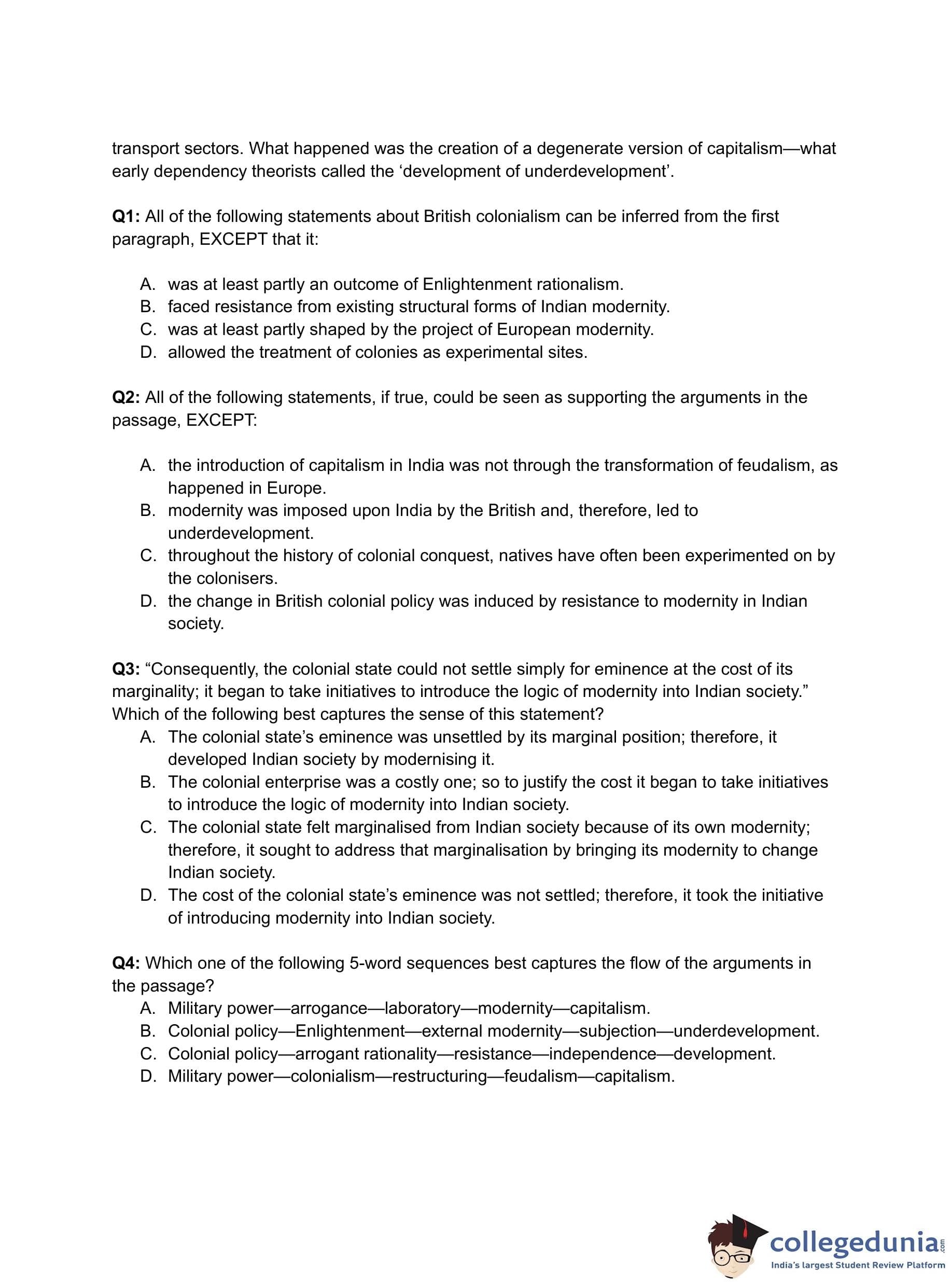 - (D) The cost of the colonial state's eminence was not settled; therefore, it took the initiative of introducing modernity into Indian society.