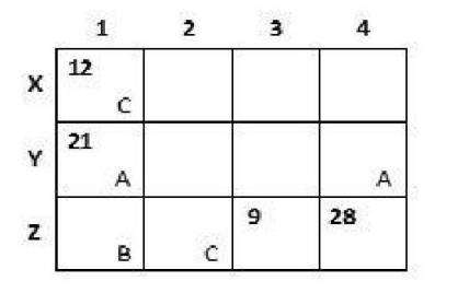 The plots in rows X, Y, Z contained mango, teak and pine trees respectively. Each plot had trees in non-zero multiples of 3 or 4 and none of the plots had the same number of trees. Each daughter got an even number of plots. In the figure, the number mentioned in top left corner of a plot is the number of trees in that plot, while the letter in the bottom right corner is the first letter of the name of the daughter who got that plot (For example, Abha got the plot in row Y and column 1 containing 21 trees).